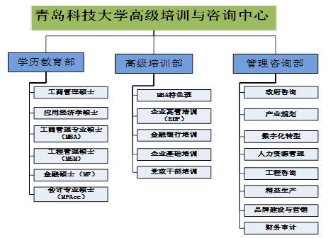 中心目前已形成三大板块:学历教育部、高级培训部和管理咨询部。其中学历教育部包括:工商管理硕士、应用经济学硕士、工商管理专业硕士(MBA)、会计专业硕士(MPAcc)、工程管理专业硕士(MEM)、金融专业硕士(MF)专业硕士;高级培训部包括:MBA特色班,企业高管培训、金融银行培训、企业基础培训、党政干部培训5个基本模块;同时依托华人色情 及国内前三咨询机构成立管理咨询部,能够提供政府咨询、产业规划、企业上市、国央企市值管理、人力资源管理、精益生产、财务管理、工程咨询等方面的咨询服务。