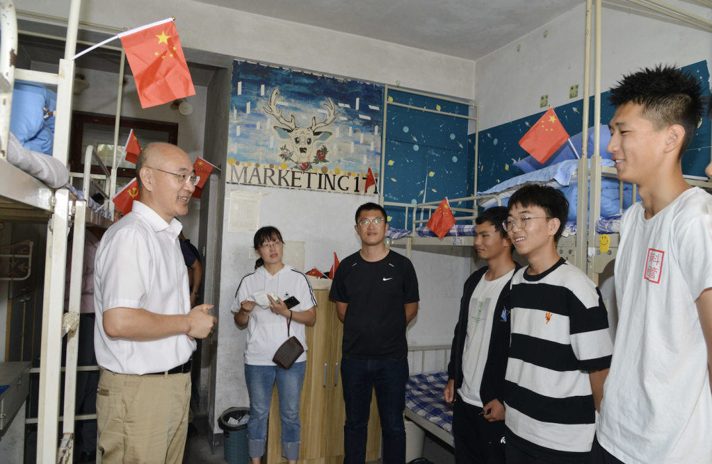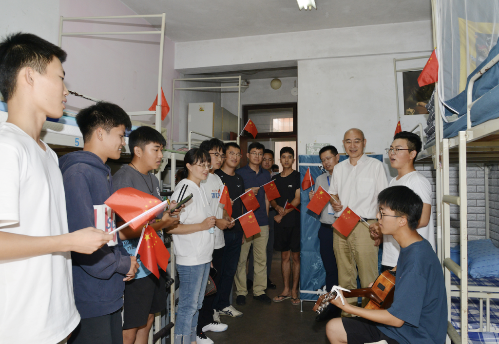 校长陈克正受邀参加了新生宿舍的主题团日活动,在崂山校区南5号楼105宿舍,同学们弹奏起吉他,和陈克正校长及其他部门老师共同歌唱《我和我的祖国》;在107宿舍,大家共同观看了央视《中国梦·祖国颂—2021国庆特别节目》,铭记红色历史,赓续红色血脉。陈克正详细了解了秋季学期开学以来同学们在校的学习、生活情况,肯定了同学们积极加入体育协会,在体育锻炼中享受乐趣、增强体质、健全人格、锤炼意志,他嘱咐同学们要厚植爱国情、砥砺强国志。陈克正表示,“要培养德智体美劳全面发展的社会主义建设者和接班人,就要始终牢记为党育人,为国育才的初心使命,切实把同学们的日常生活丰富起来,积极推动体育改革进程,引领青年学子立大志、明大德、成大才、担大任,深入践行‘请党放心、强国有我’的铿锵誓言,为实现中华民族伟大复兴作出科大学子应有的贡献。”