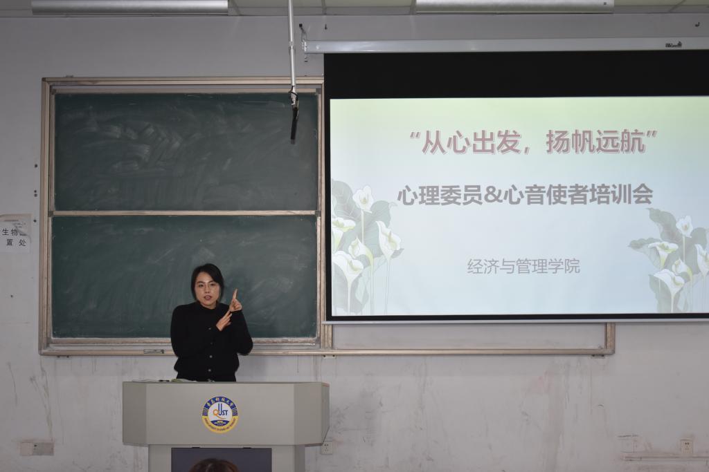 于弘毅楼E303教室开展“从心出发,扬帆远航”心理委员&心音使者培训会,培训会由学院心理工作站站长付凯主讲,各年级心理委员以及心音使者参加了此次学习。