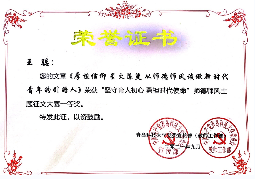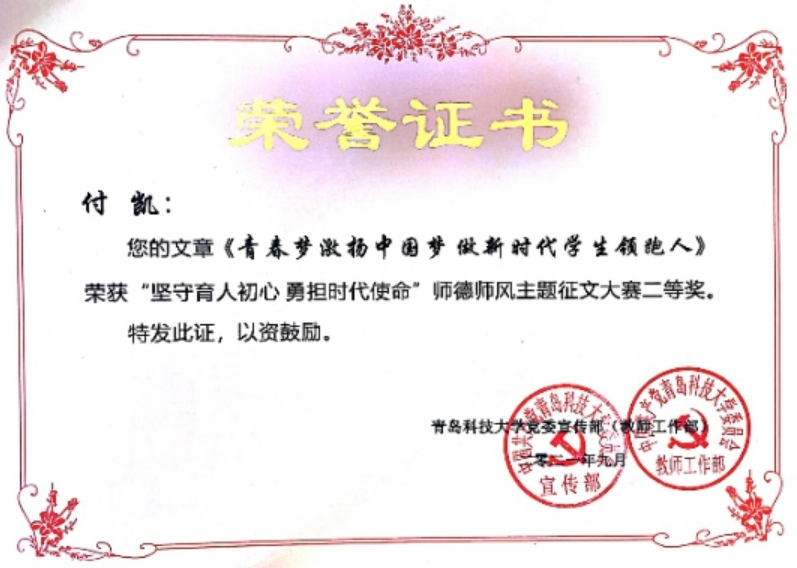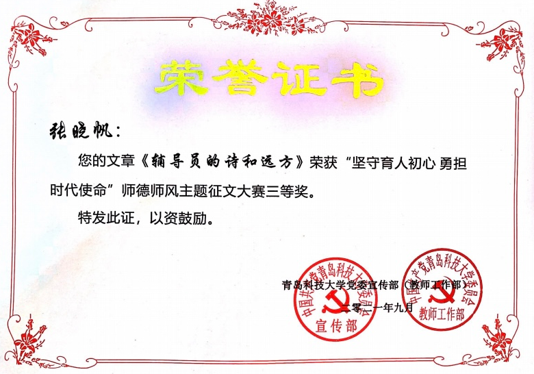 其中,学工办主任、团委书记王聪老师的文章《厚植信仰 星火滚烫 从师德师风谈做新时代青年的引路人》获大赛一等奖,付凯老师的文章《青春梦激扬中国梦,做新时代学生领跑人》获大赛二等奖,张晓帆老师的文章《辅导员的师和远方》获大赛三等奖。