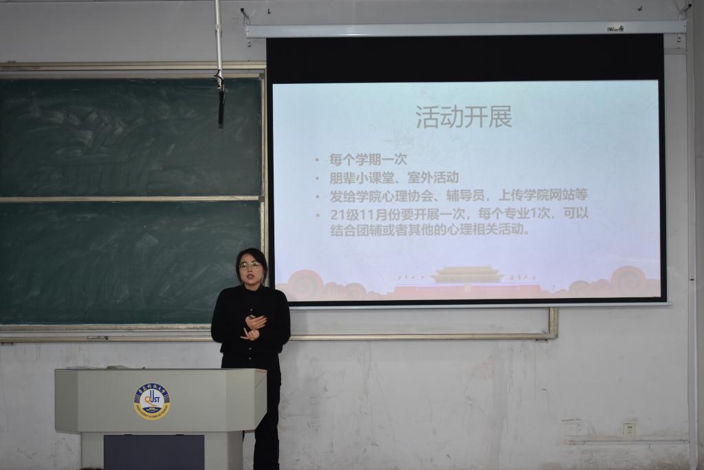 会议上,付凯首先通过视频引入心理问题的讲解,给大家讲明了心理疾病的症状。进而提出心理委员应承担作为心理知识传播者、心理信息传递者、心理困扰帮助者、心理活动组织者的职责。明确了心理委员的工作内容。随后付凯通过“情有千千结”“大风吹”等一系列心理小活动让同学进行现场互动,让心理委员更加深刻理解自己的职责义务所在。
