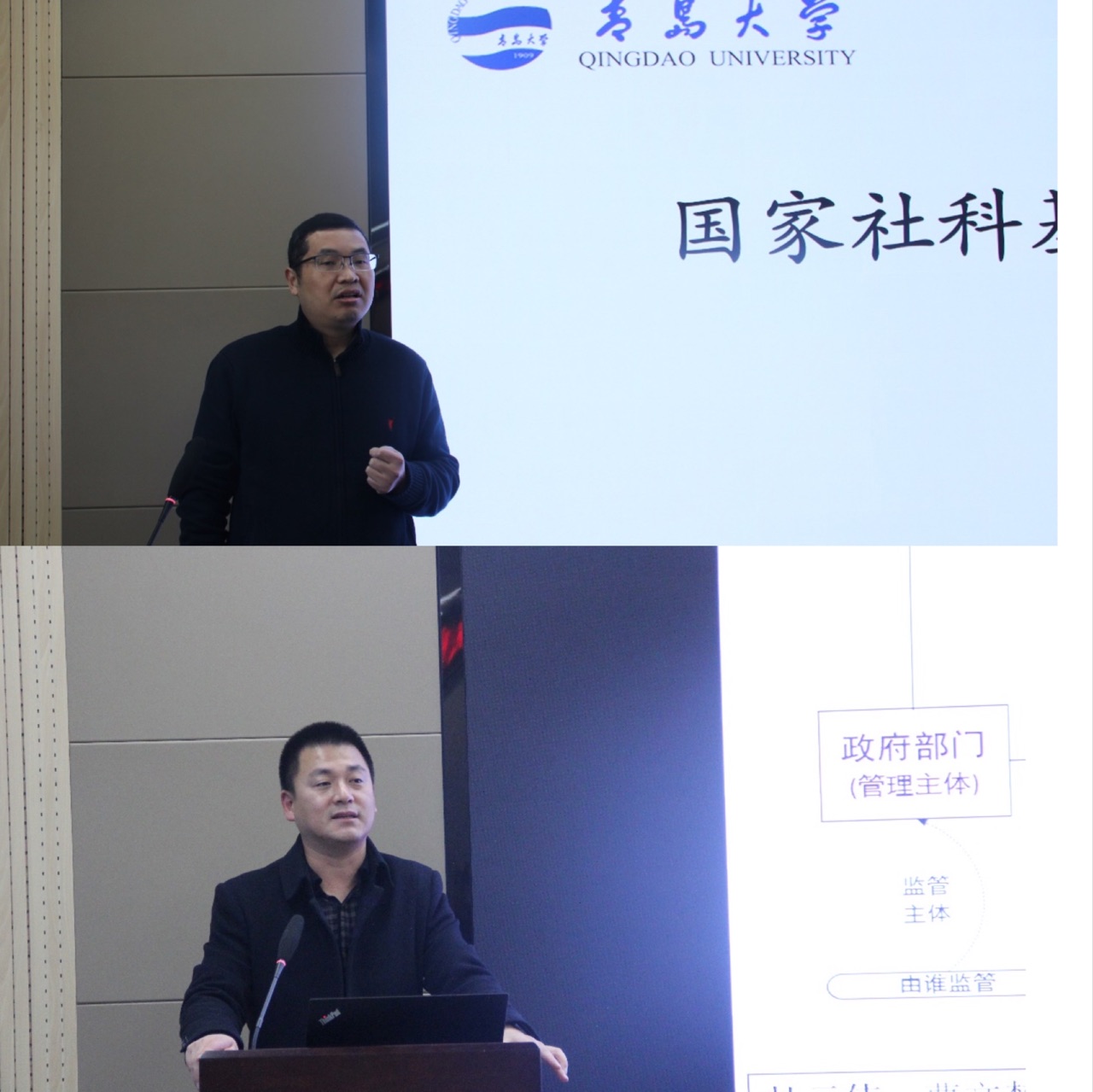 于313会议室举行了2022年国家社科基金申报交流会。学院邀请中国海洋大学杜元伟教授和青岛大学经济学院靳卫东教授做专题报告,拟申报国家社科基金的老师参加了会议,院长李勋来教授主持交流会。