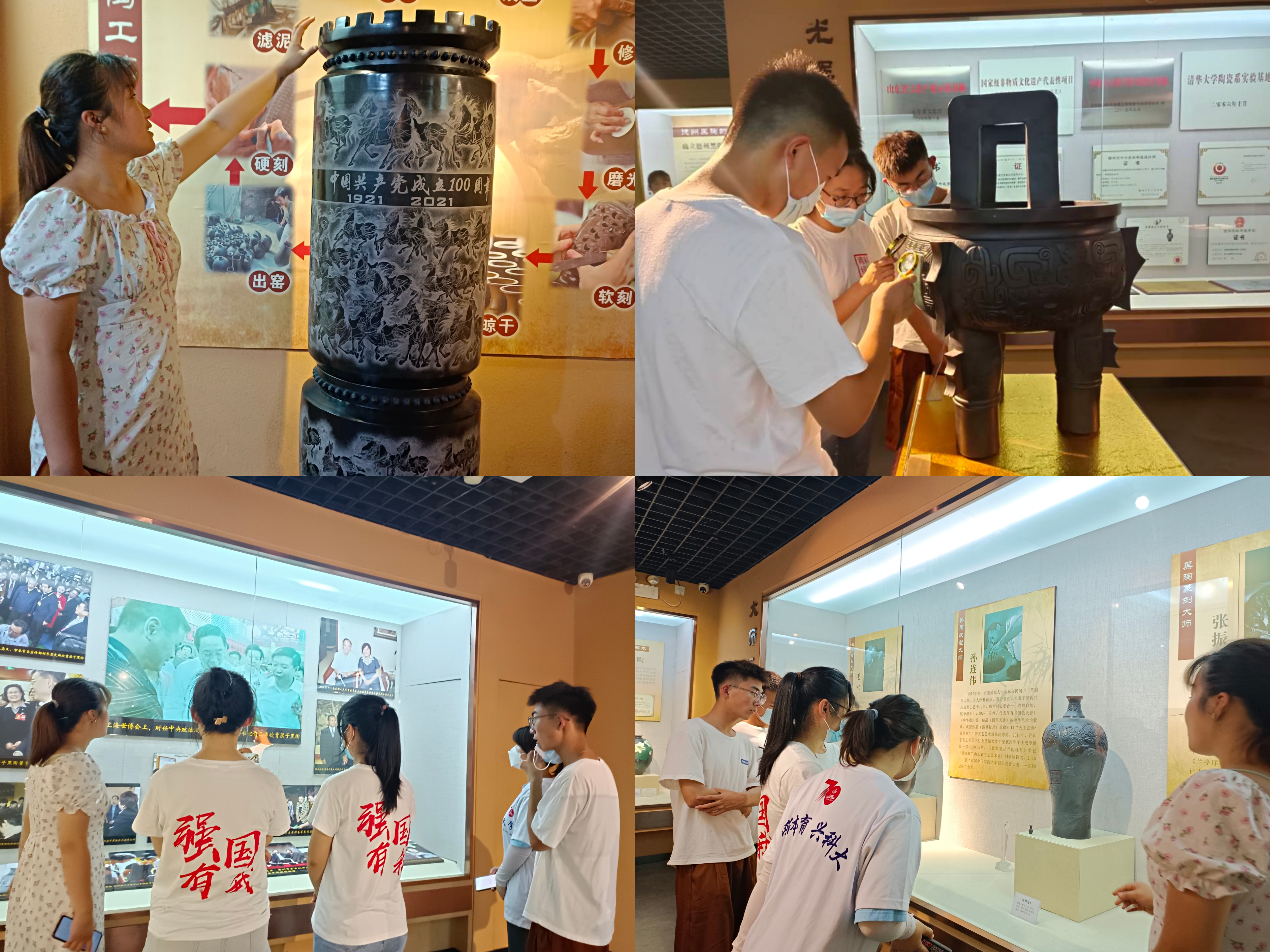 参观了整个黑陶博物馆的,实践队员领略了黑陶的前世今生,黑陶文化以大汶口文化为最早,距今已有月6000年历史,因以黑色陶器为主要特征,又称为“黑陶文化”,博物馆的蛋壳陶曾参加《国宝会说话》节目。黑陶匠人们也在不断创新新工艺,参观中有幸了解了三种新工艺,第一个是金丝漆陶工艺,借鉴北京景泰蓝掐丝点燃工艺;第二个是硬刻陶工艺;第三个是漆画工艺,美轮美奂的工艺品深深地打动了实践队员。在进一步了解黑陶文化、观看黑陶作品、参观黑陶技艺后,实践队员们深入了解德州黑陶文化的魅力。黑陶文化是中华民族源远流长的文化长河中孕育的一颗璀璨的明珠,是人类历史发展中最辉煌的篇章,被当今社会各界誉为“土与火的艺术,力与美的结晶”。如今,黑陶艺术已经享誉全国,而且在世界不少地方也引起了很大关注。让民族的文化艺术传播更加广泛,让非遗文化被更多熟知是实践队员大学生应承担的责任和义务。