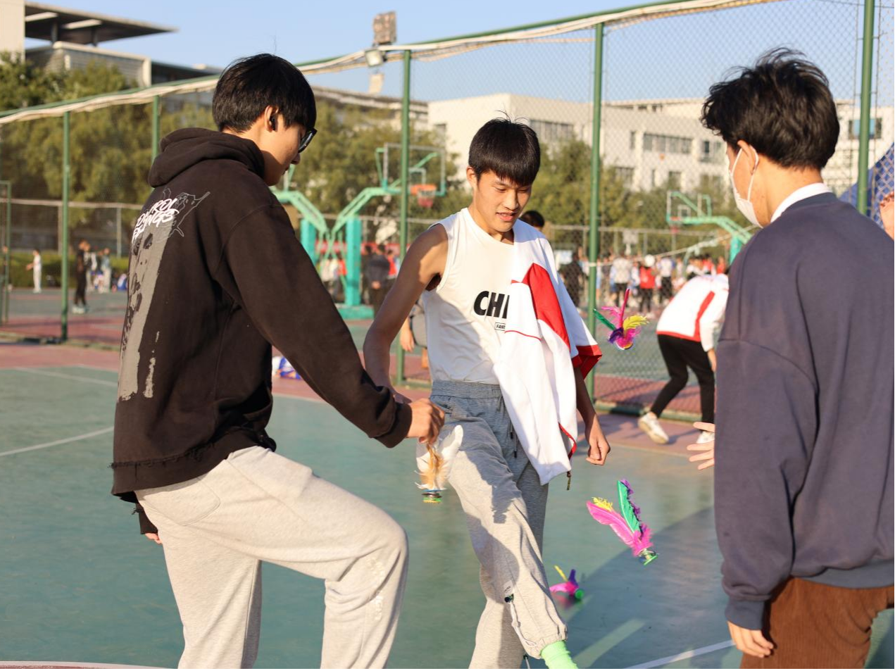比赛中,他们在这个属于青春的舞台尽显风采,展现不轻易言弃的斗志,发扬顽强拼搏的体育精神。小小的毽子在空中飞舞,阳光下折射它美丽的羽毛。毽子和鞋子碰撞在一起发出很有节奏的声音,那股不气馁、不放弃的韧劲儿在每一个运动健儿身上演绎着!所有人在运动中体会着快乐,收获着成功。、