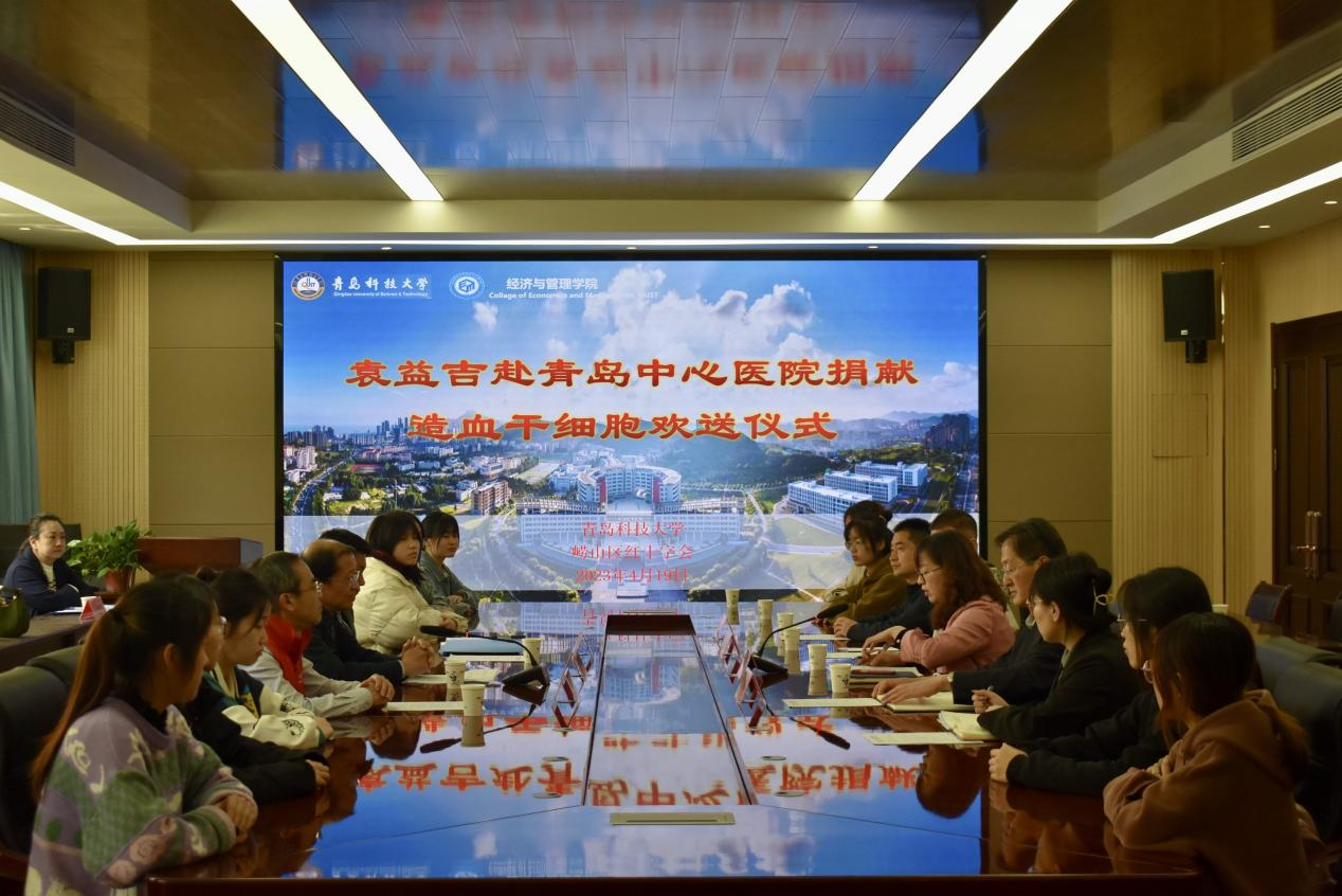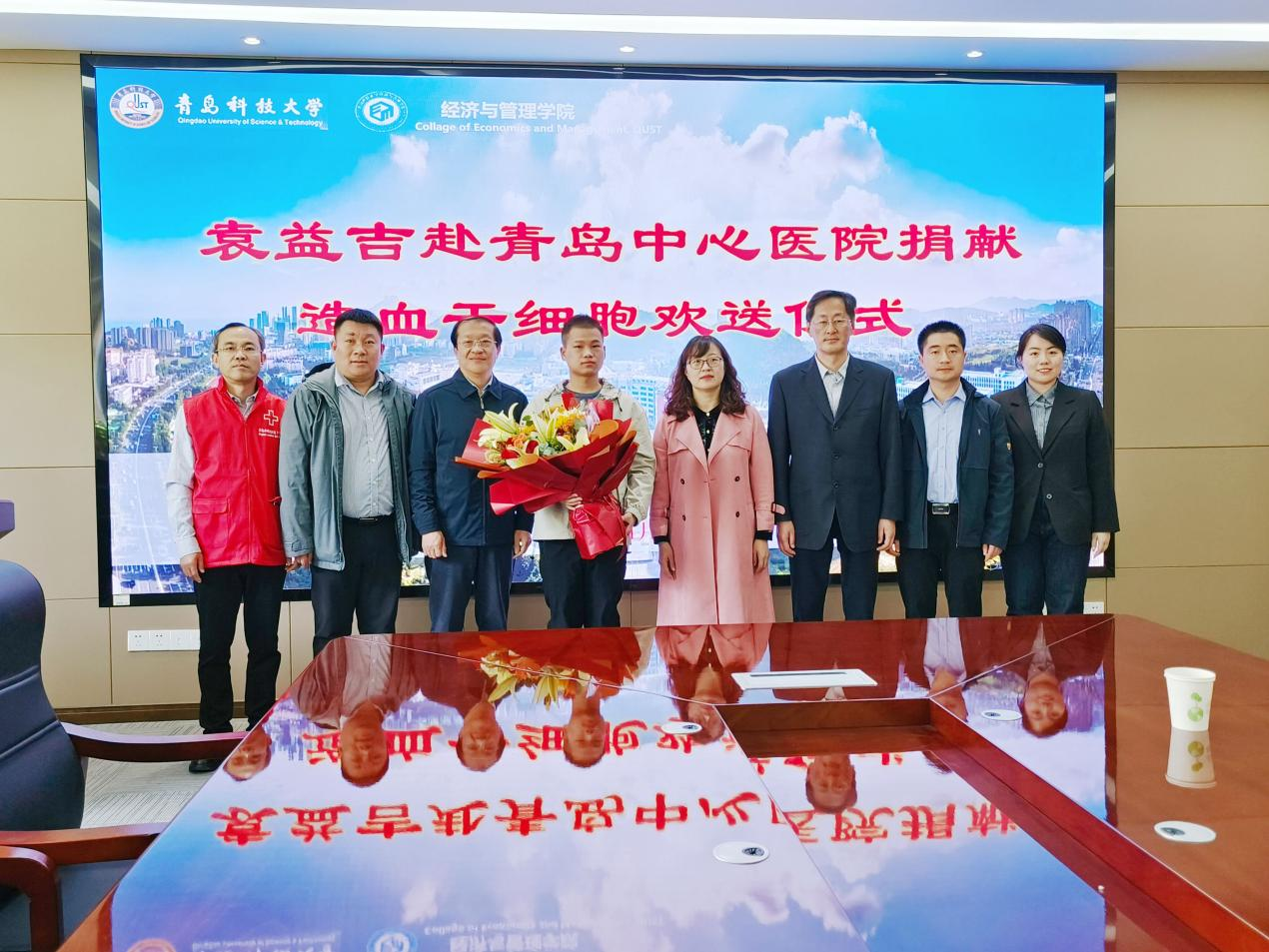 4月19日上午,学校与崂山区红十字会举办崂山区第18例造血干细胞捐献志愿者袁益吉赴青岛中心医院捐献欢送仪式。党委学生工作处处长王丽、经济与管理学院党委书记李德成、经济与管理学院党委副书记牛宝卫、经济与管理学院学生袁益吉、崂山区红十字会党组书记、常务副会长梁光,崂山区红十字会党组成员、专职副会长王鲁青,崂山区道德模范、崂山红十字志愿服务队队长刘伟浩出席会议。