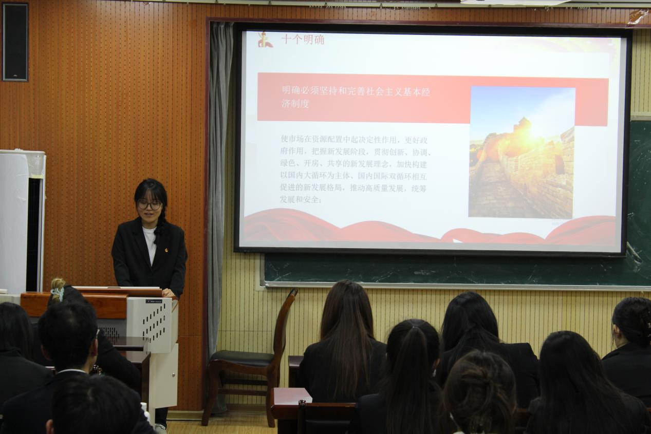 之后,润心宣讲团代表王玺媛以“坚持思想引领,筑牢信仰根基”为主题,重点围绕“两个结合”、“六个必须坚持”、“十个明确”、“十四个坚持”、“十三个方面成就”等方面开展学习研讨,增进学子对党的创新理论的政治认同、思想认同、理论认同、情感认同。