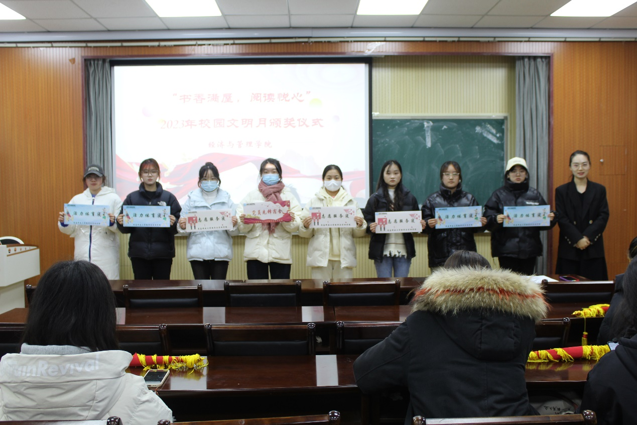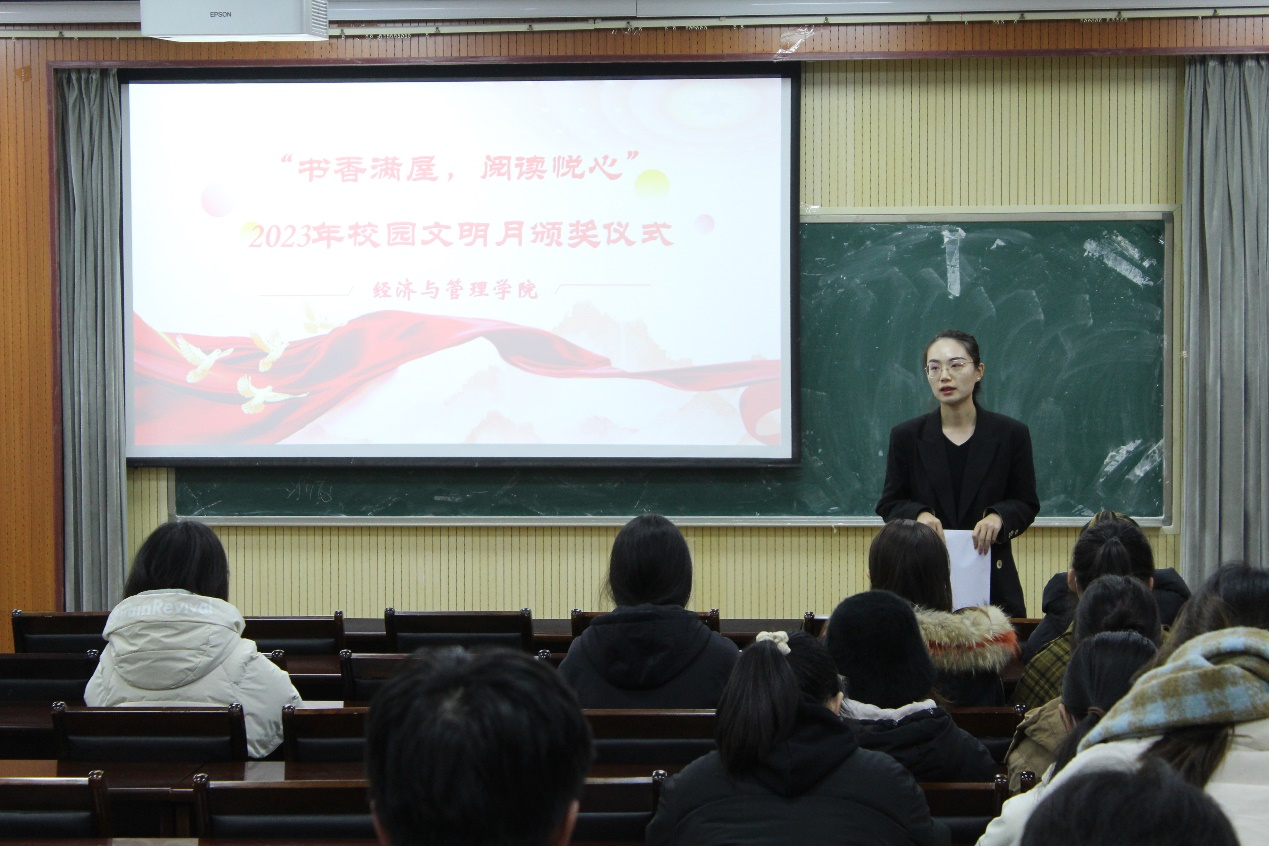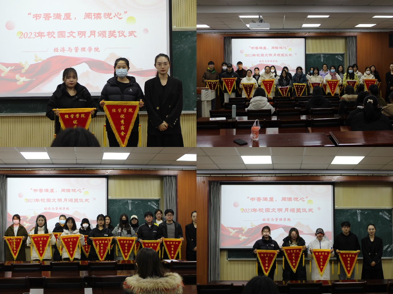 于经管楼419举办“书香满屋,阅读悦心”校园文明月优秀宿舍表彰大会暨颁奖仪式,学院分团委老师占晓祎出席活动。