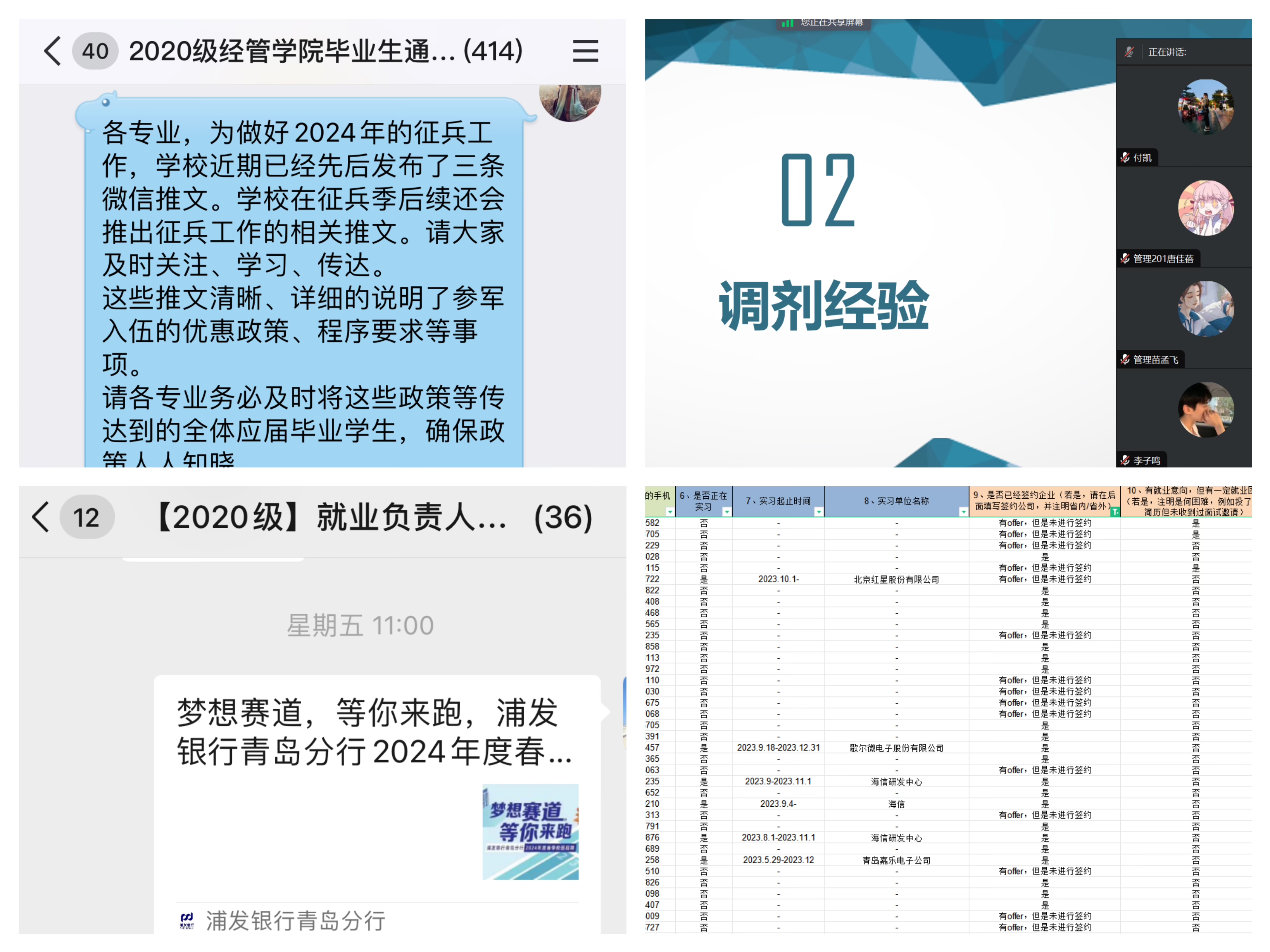 不断拓宽线上就业渠道,着力推进“青鸟计划”云上招聘、2024年春季学期校园招聘,依托微信、QQ平台持续更新线上招聘信息发布群,动态调整学生就业需求库,加大精准推送岗位力度,聚焦助推青年学生就业,通过朋辈交流、师生问答、政策咨询、简历问诊、面试指导等丰富多样的形式提供就业服务;开展一般院校低收入家庭就业困难学生结对帮扶工作,组织团干部与学生进行就业结对,实时沟通了解学生就业意向、岗位需求并及时为学生提供就业信息,进一步提升学生求职素养,积极为就业困难和未就业的同学筛选合适的实习和就业岗位,提供锻炼和就业机会;在应征入伍工作中,学院坚持优化工作程序,大力宣传征兵政策,为参军入伍学生提供全方位、全过程的“一站式”优质服务。