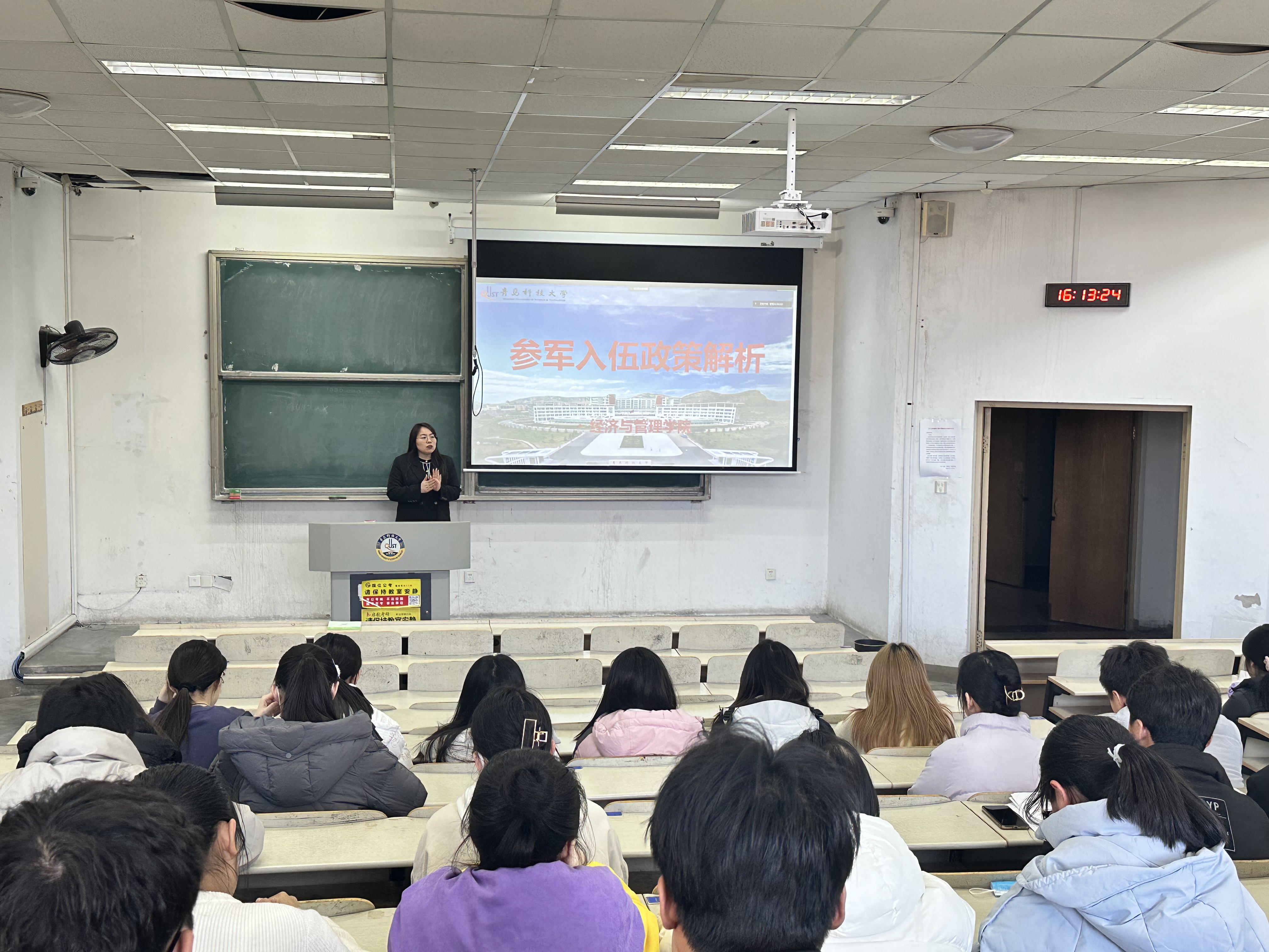 会议最后,付凯老师进行了征兵入伍动员,她从征兵条件、报名流程、优待条款、个人成长和才能发展、退伍后的安置等方面,向在场的学生们详尽阐述了有关征兵政策和优惠条件,帮助同学们全面认识了大学生应征入伍的深远意义,从而增强自己对公民服兵役责任感的认识以及携笔从戎保家卫国的决心。