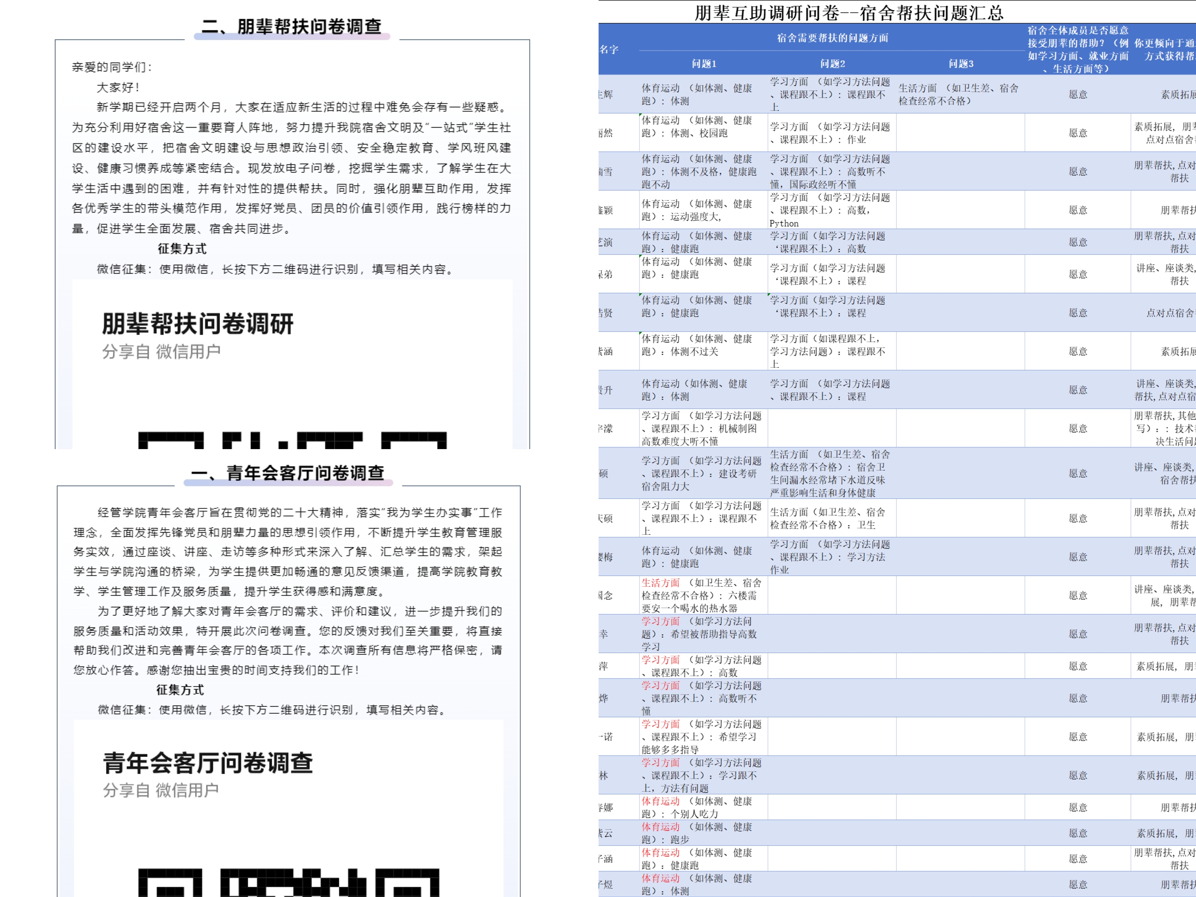 会议伊始,权益部就2024级朋辈互助调研问卷情况进行汇报。问卷围绕宿舍帮扶问题展开,共发放46份且全部回收,精准呈现了新生宿舍的需求现状。数据显示,约50%的宿舍需要帮扶,问题集中于体育、学习、生活三大板块。其中,体育方面有 14间宿舍亟待支持,学习上有18间宿舍渴望助力,生活方面有 4间宿舍期待援手。