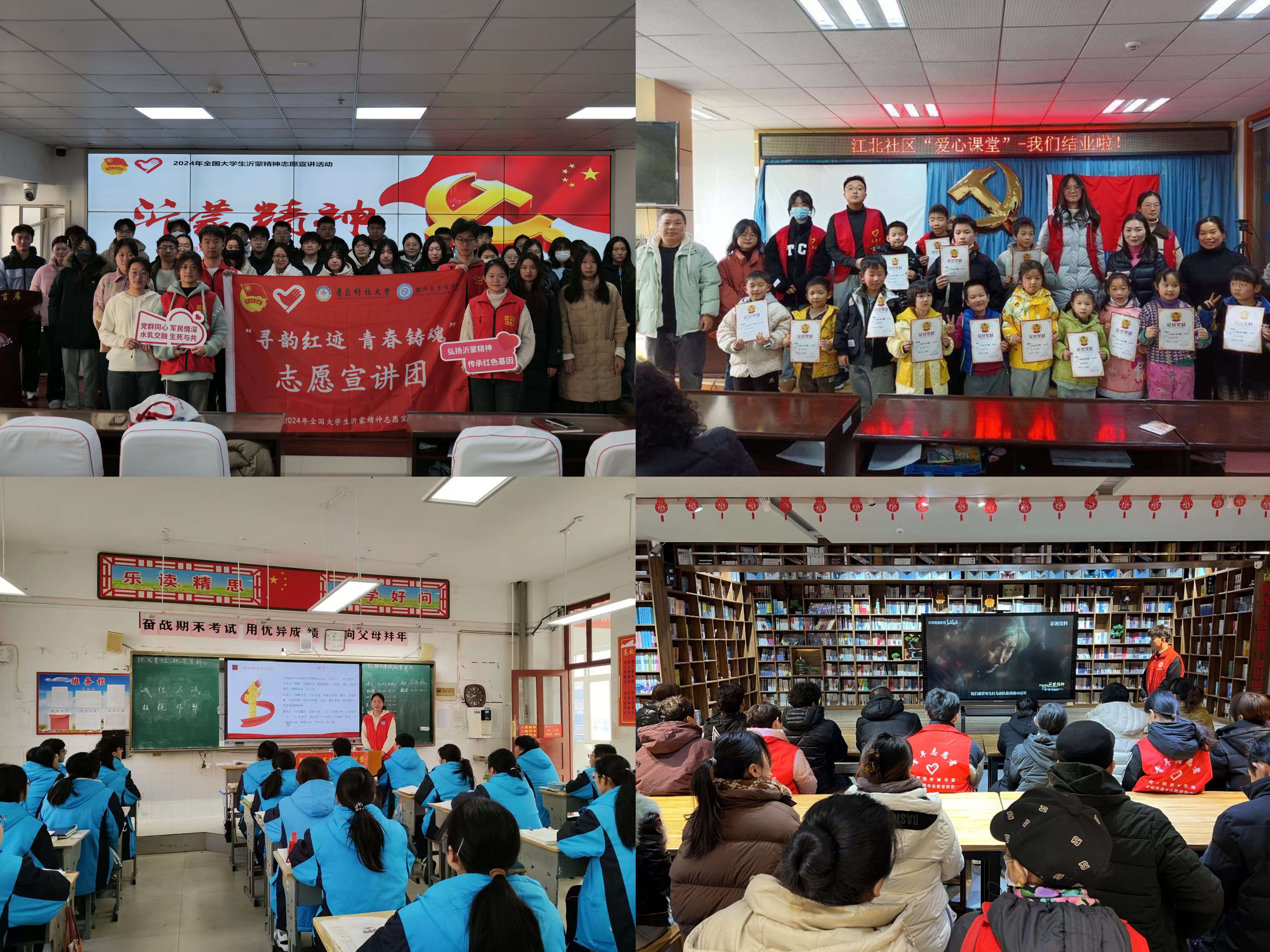 学子聚焦“银发族”与“新生代”,深入社区、敬老院和学校,开展了一系列丰富多彩的志愿服务活动,用真情传递温暖,用行动践行责任。“遗”路生花寻年队通过发放问卷、科普宣传的方式,深入挖掘更多家乡的传统文化宝藏,让优秀文化在新时代绽放出更加璀璨的光芒。周保中将军纪念馆志愿服务团队走进云南省大理市周保中将军纪念馆,为浏览游客开展导览与讲解服务。吸引更多的人关注红色教育,发扬伟大先烈的英勇事迹,坚定人民理想信念。“情系家乡,爱在莱州”团队奔赴莱州市后李村,为空巢老人提供生活帮扶和精神陪伴,对留守儿童进行心理评估与心理疏导,送去生活物资、开展精神慰藉。团队成员陪伴他们聊天、打扫卫生、制作年夜饭,让老人与孩童在寒冬中感受温暖。