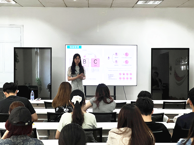 张岍以互动游戏“抓手指”及“10-90岁主要压力”的视频作为开场快速实现破冰,缓解了同学们的紧张情绪,促进了彼此间的交流;视频内容生动引入,引发同学们的思考,也激发了对于压力知识进行了解学习的兴趣。随后,张岍从压力的概念、产生原因及应对方面展开讲解,主要讲述了应对的方法,从情绪管理、认知管理、时间管理、目标管理及生活方式管理方面给出了全面可行的压力缓解方法,并强调适度的压力可以激发人的潜力,过度的压力则会适得其反,引导学生灵活运用上述各个层面的方法将压力控制在合适的范围内并利用其提升自身效率。