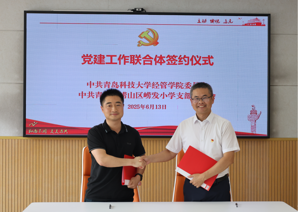 党委副书记牛宝卫与崂发小学校党支部书记丁鹏共同签署《党建共建协议》,明确通过组织联建、活动联办、资源联享等方式,构建“优势互补、共建共赢”的党建工作新格局。