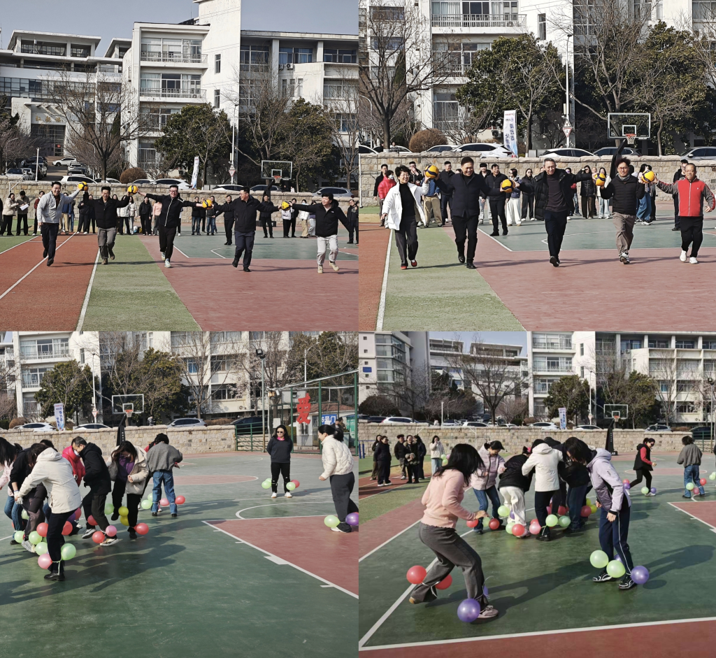 “齐心协力”项目作为考验团队协作的经典项目,充分诠释了“同心同向,其利断金”的道理。比赛现场,参赛教职工五人一组每两人共同推着同一排球,大家齐声喊着“一二、一二”的整齐口令,步伐协调一致、配合默契无间,即便中途出现小失误,也能迅速调整节奏、携手前行,展现出极强的团队凝聚力与协作精神。如果说“齐心协力”展现的是团队的同心之力,那么“踩气球”项目则充满了欢乐与竞技的碰撞,将现场气氛一次次推向高潮。比赛开始前,教职工们在脚踝处绑好气球,随着裁判一声哨响,大家迅速进入状态,或灵活躲闪、或主动出击,赛场瞬间变成了欢乐的海洋。清脆的气球爆裂声、欢快的笑声、兴奋的呐喊声交织在一起,驱散了工作的疲惫,释放了心中的喜悦。