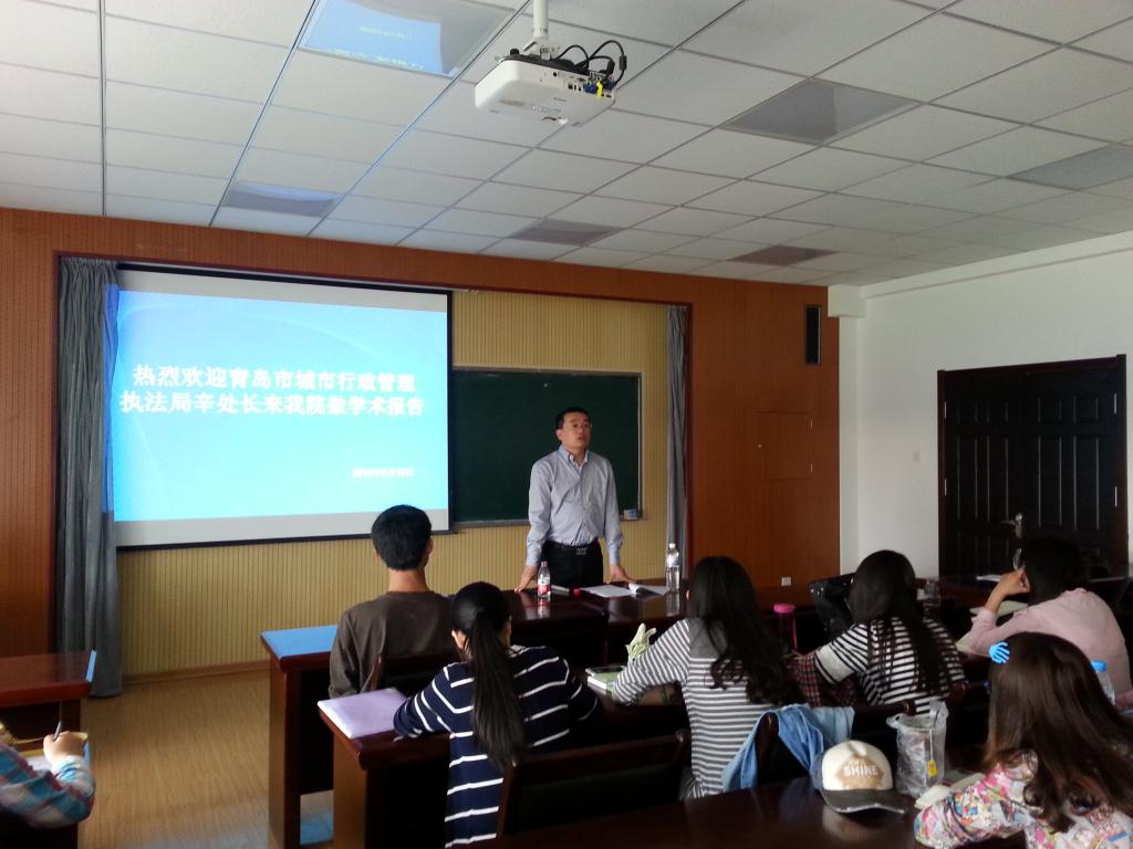 2014年5月14日下午,青岛市城管执法局法规处辛洪毅处长应邀来我院,在经管楼505为城市管理专业做了题为“城市管理与城市管理执法”的报告。