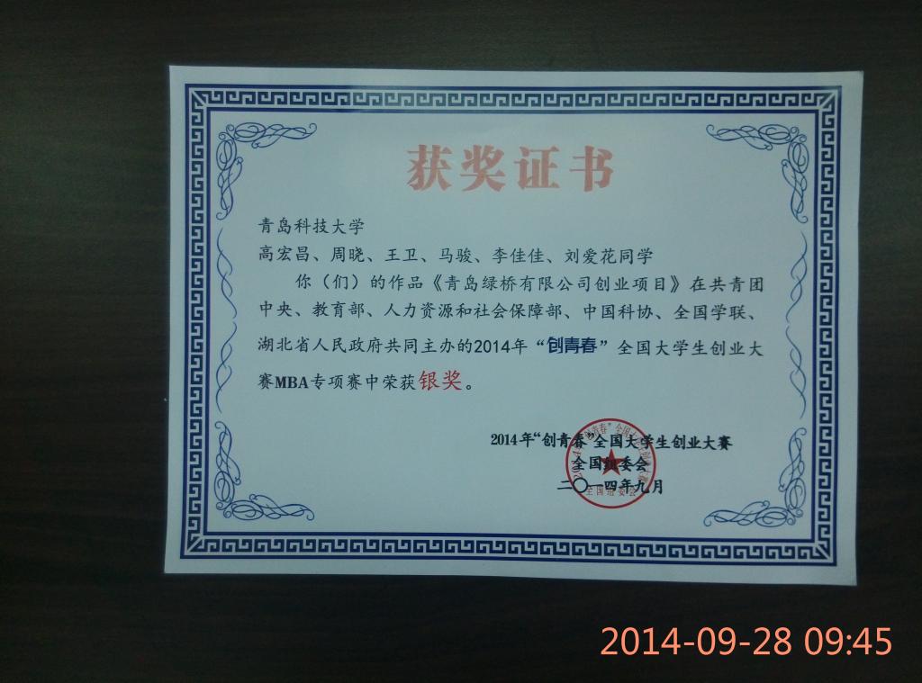 9月26日,由团中央、教育部等多个部门共同主办的 “创青春”全国大学生创业大赛首届MBA专项赛终审决赛在湖北襄阳市落下帷幕,我校MBA代表队推出的“青岛绿桥有限责任公司有机果蔬电子商务配送项目”经过多轮角逐,从全国237所高校中脱颖而出,喜获银奖,在山东省参赛高校中名列第二,这是我校开展MBA教育以来所获层次最高的创业大赛奖项。
