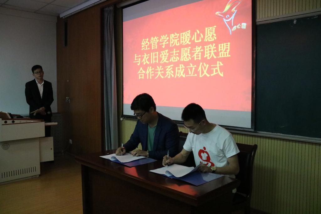 暖心愿与衣旧爱志愿者联盟合作关系成立仪式于经管楼504室成功举行。衣旧爱志愿者联盟会长王龙、华人色情