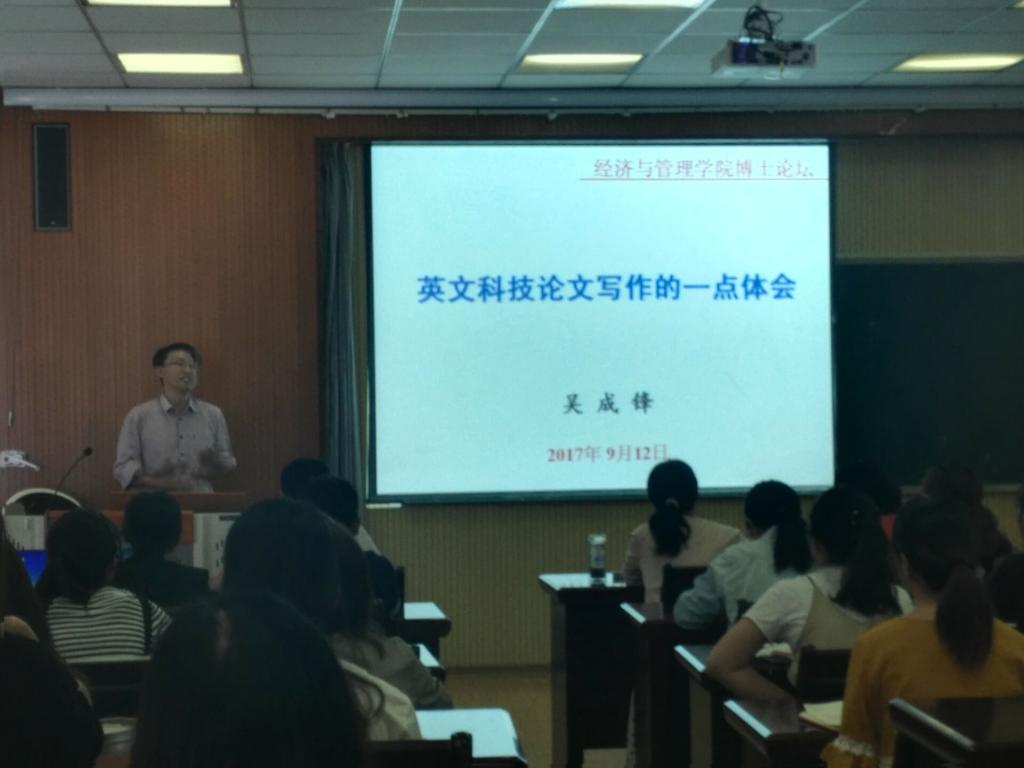 随后,吴成锋老师饱满热情地和大家交流了发表高水平英文论文的写作、投稿以及如何从审稿中发现新的研究问题等经验,吴老师展示了如何做到既有宏观上把握又有细节上斟酌,深入浅出,让同学们“触摸到”了国际论文写作和发表的心理历程,感受到了做学问的艰辛、快乐。