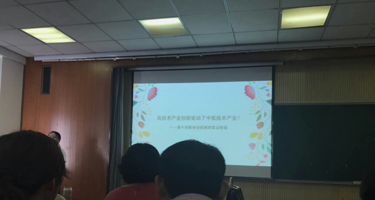 第二个阶段2015级研究生商圆月同学讲了她最新的科研论文研究成果。作为学校的学术之星,她向新同学们展示了她严谨的学习态度和把握问题、分析问题的能力。其论文题目为《高技术产业创新驱动了中低技术产业?——基于创新驱动机制的实证检验》。该论文主要通过理论模型对高技术产业创新驱动中低技术产业的过程进行了剖析,并以制造业数据为例进行了实证检验。周南南和王裕锦老师对文章给出了精彩点评,同学们也加入了热烈地讨论。