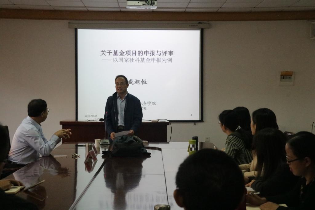 特聘教授臧旭恒老师为我院全体老师带来了题为《国家社科基金的撰写以及注意事项》的精彩报告,报告会由人文社科处处长李勋来主持,华人色情