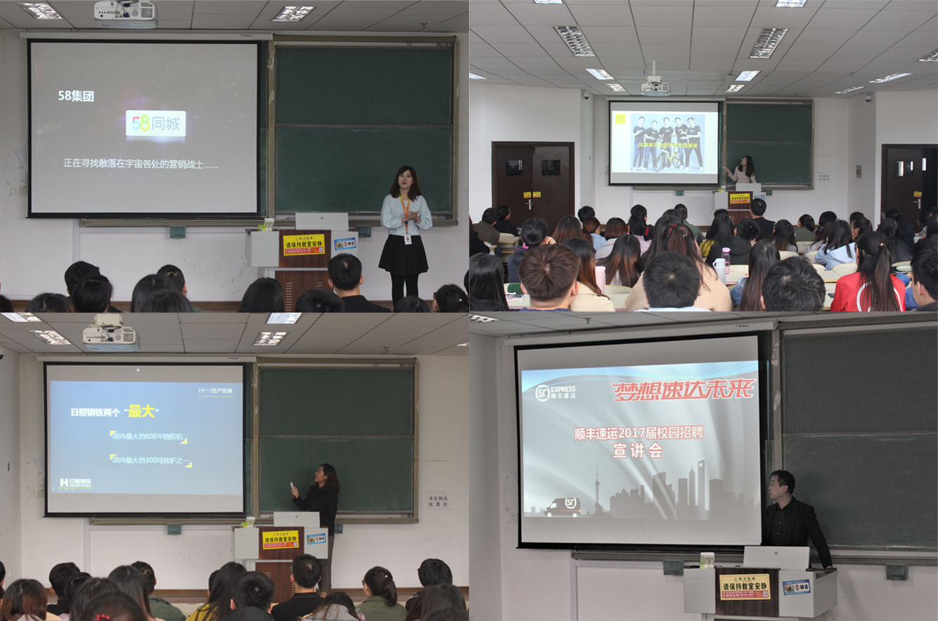 本场企业宣讲会由物流管理专业老师亲自组织,邀请顺丰、邮政、58同城、OFO小黄车、日照钢铁等七家知名企业进校宣讲,宣讲会采取企业轮番上场宣讲PK的方式进行。七位企业宣讲人依次上台介绍自身企业,以企业日常工作视频、岗位职工照片展示、文化宗旨实例宣传等方式全面介绍企业战略、发展前景、运营模式和人才储备需求,七家企业各展奇能,选贤纳士各出奇招,开创就业双向选择新局面。本次宣讲会的召开同时为同学们上了一堂别开生面的就业指导课,帮助学生深入贴近企业和就业市场,为学生提供了检验自身专业能力的实践平台和提高实操水平的市场化指导。