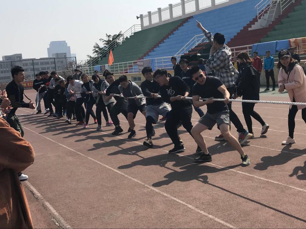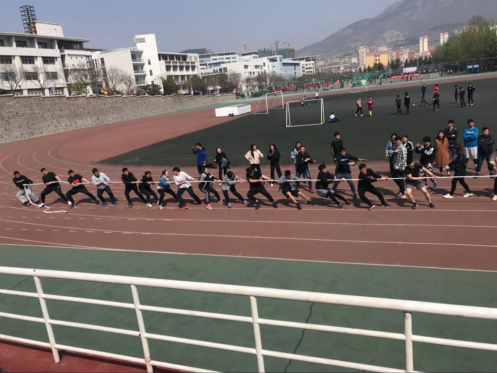 在崂山校区南苑体育场举行了一场别开生面的拔河比赛。