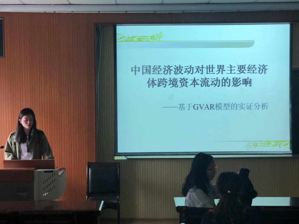 随后,2017级研究生马洁向在座师生汇报了题为《中国经济波动对世界主要经济体跨境资本流动的影响——基于GVAR模型的实证分析》的论文,该论文主要通过建立全局向量自回归模型(简称GVAR),进行脉冲响应及广义预测方差分析,得出中国GDP、利率和名义利率冲击对各经济体跨境资本流动的影响具有差异性的结论。接着,教师代表陈阳和陈明对论文做了精彩的点评,并提出了合理的修改建议,马洁同学对各位老师的指导表示了感谢。