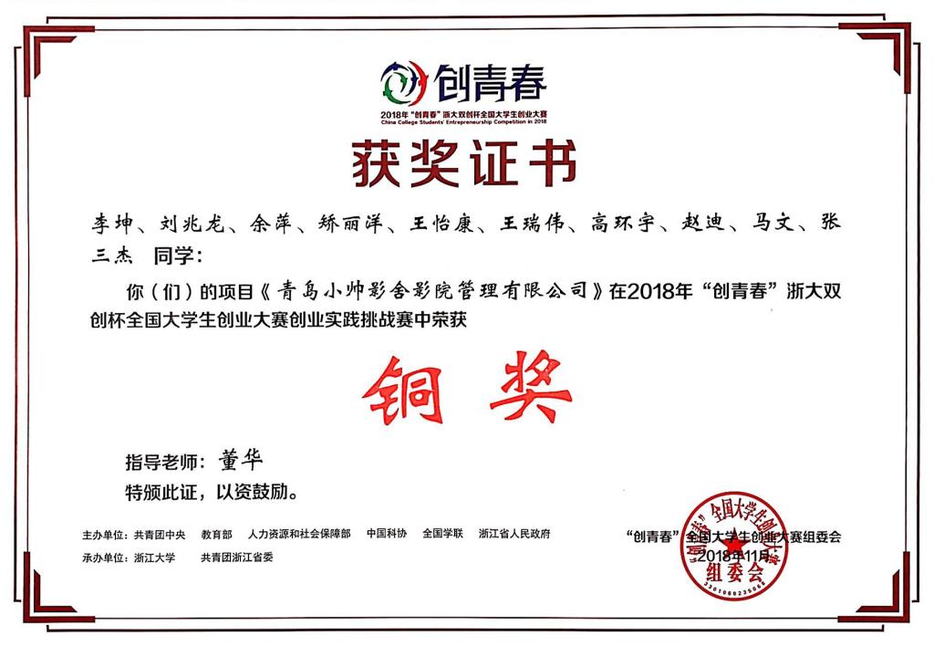 11月3日,“创青春”浙大双创杯全国大学生创业大赛在浙江大学落下帷幕。我院推送的作品《青岛小帅影舍影院管理有限公司》获得创业实践挑战赛铜奖。本次大赛由共青团中央、教育部、人力资源社会保障部、中国科协、全国学联、浙江省人民政府主办,浙江大学、共青团浙江省委承办。