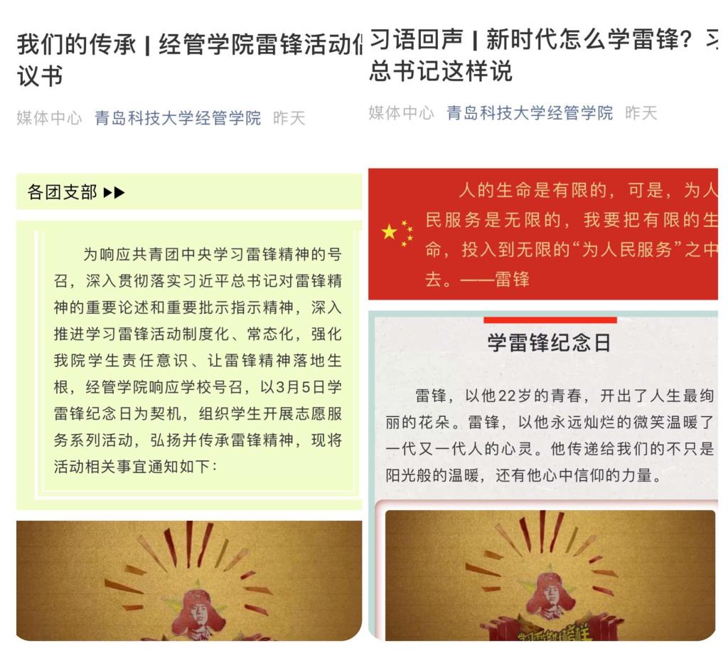 学院面向全体团员发出关于开展“传承弘扬雷锋精神 争做新时代雷锋传人”活动的倡议书,各年级团支部积极响应号召,以“人人学雷锋”——开展主题团课教育、“天天学雷锋”——开展主题实践活动、“时时有雷锋”——设立支部雷锋服务队三种形式续写雷锋故事,播撒雷锋火种,诠释了新时代新青年的新风尚。