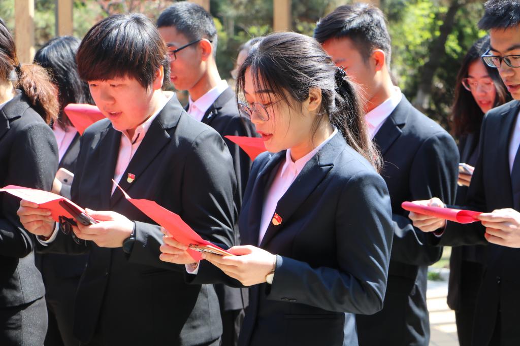学院学生党支部开展“红色朗读--一党员一段文”红色朗读主题党日活动。苍翠的松柏下,肃穆的音乐中,财务(3+4)171班许心如、国贸162班欧阳文璐、物流161班程亚男、亓长智、薛明远依次带来朗诵《盛世中国》和《我是青年》,全体党员集体朗诵了《祖国啊,我亲爱的祖国》,红色书声,声声入耳,一场朗读,读出了新时代青年学子的雄心壮志和信心满满。随后,全体党员在鲜红的党旗下重温入党誓词,洪亮铿锵的声音,豪迈有力的誓言饱含了大家致敬先烈,传承英雄精神的坚定决心。党员们纷纷表示,将汲取红色力量,把对革命先烈的怀念和敬仰之情,转化为立足本职、敢为人先的力量,将个人发展与国家命运相结合,真正做到“内化于心,外化于行”。