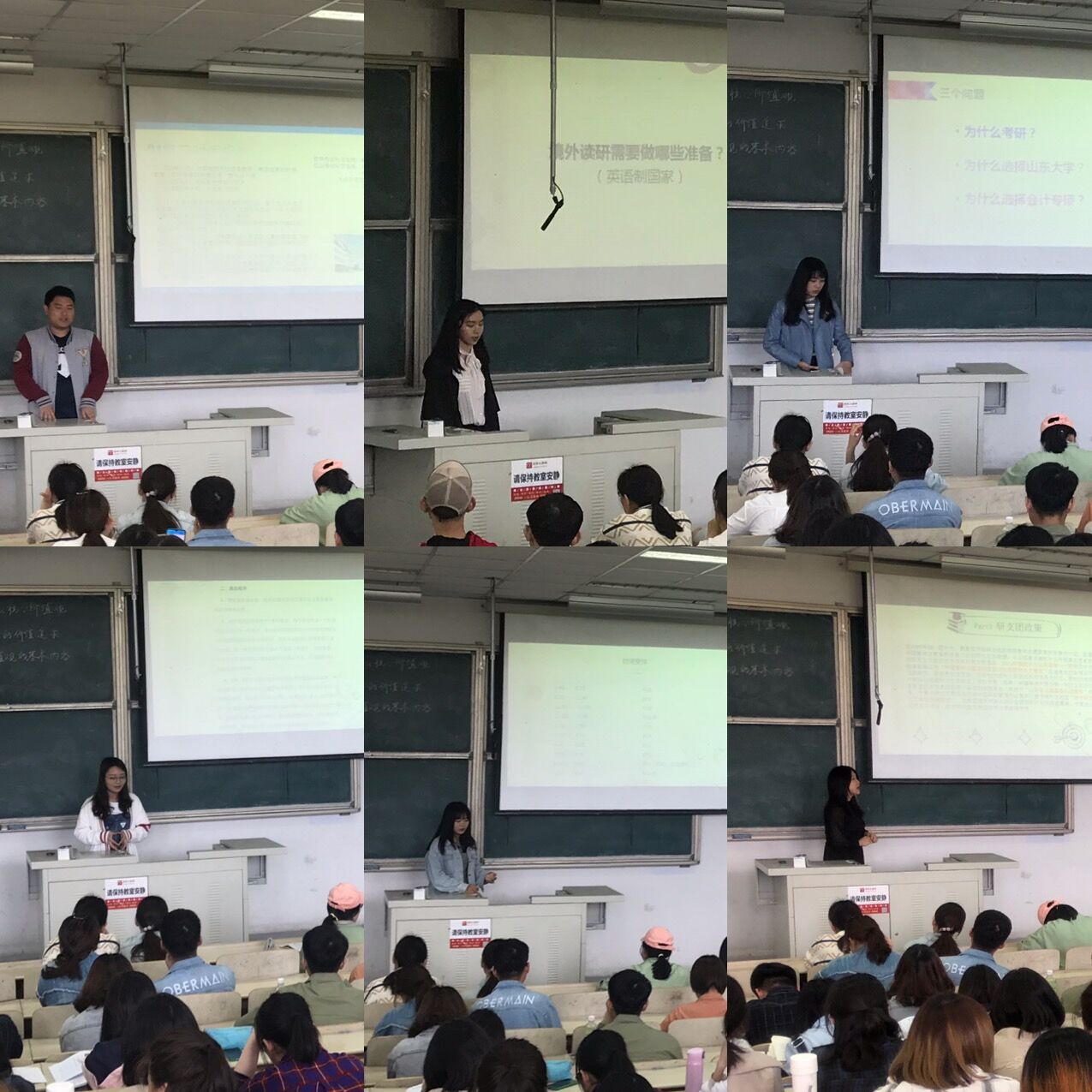 的国贸151班初桂民则从选取学校,选取专业的几个小故事入手,用身边人身边事给大家做了目标制定、计划执行的针对性指导;拿到南加州大学录取通知书的国贸151班吴越则从出国申请、材料准备及个人规划等各方面为大家做了出国申请的详细介绍;入选第21届研究生支教团的管理151班郑琦学姐动情为大家讲述了研支团政策和她的初心,鼓励同学们投身志愿服务,展现新时代青年的担当。