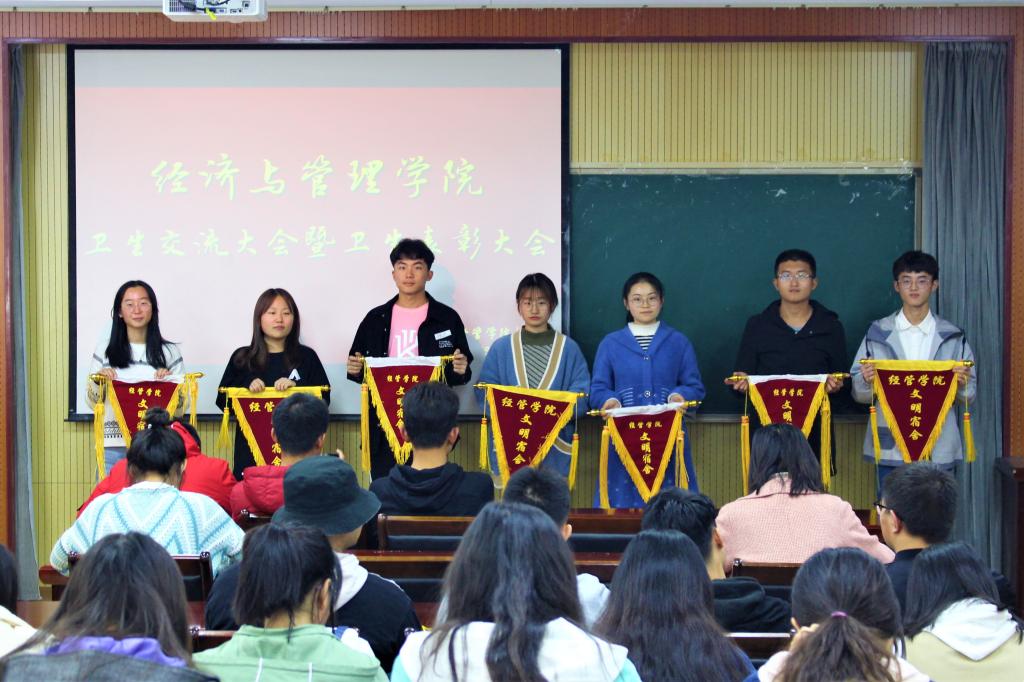 大会伊始,学生会权益部副部长刘连策简单讲解了月末评比机制以及表彰大会的主要内容。随后,由付凯老师为优秀宿舍颁发锦旗,并就宿舍卫生、安全和学习教育三个方面强调了宿舍卫生检查的重要性,要求同学们重视卫生工作,加强自律管理。付凯老师指出:“作为经管的一份子,全体师生都要树立大局意识和集体荣誉感。宿舍环境在很大程度上决定了大学生在校的业余生活质量,对于优良学风的创建、生命财产安全的保障都具有重要意义,希望学生会成员、各班生活委员及宿舍长起好模范带头作用,卫生管理信息传达做到准确、及时、高效。坚定自己作为一名学生骨干的初心和使命,积极动员班级同学齐心协力做好宿舍卫生和管理工作。”会议最后,权益部副部长刘连策对会议进行总结,再次说明学院卫生检查要求及卫生奖惩制度,并希望大家积极配合,全面提升宿舍生活水平,为学院争先争优。至此,会议圆满落幕。