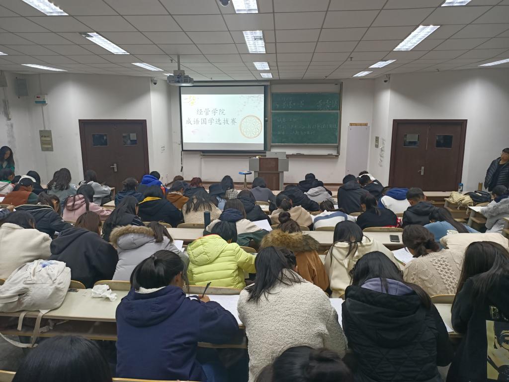2018级和2019级八个专业共90名的成语爱好者和国学知识爱好者。比赛分为成语大赛和国学大赛两个阶段。在第一阶段成语大赛的比赛过程中,选手们奋笔疾书、思维敏捷、一挥而就,依次完成了成语释义、一字组多词、成语接龙以及根据提示写出成语四个部分的试题,卓越实力显露无疑。第二阶段国学大赛以笔试方式进行,题目由选择题、填空题和判断题三部分组成,选手们答题游刃有余、从容不迫,能够引经据典,可谓是“胸藏文墨虚若谷,腹有诗书气自华”。