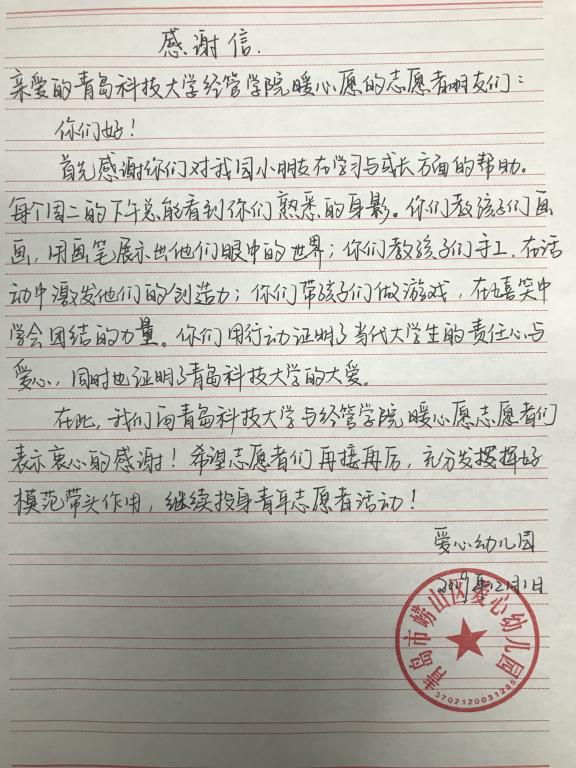 信中特别表扬暖心愿志愿服务团队的志愿者们始终坚守初心,勤勤恳恳、不辞辛苦,坚持为崂山区爱心幼儿园的小朋友们献爱心、送温暖。这封感谢信是对我院志愿服务工作的高度肯定和赞扬,同时也是对志愿者们的认可。青年志愿者协会也将一如既往,更加努力,为学院精神文明建设和需要帮助的群体献出自己的一份力量。