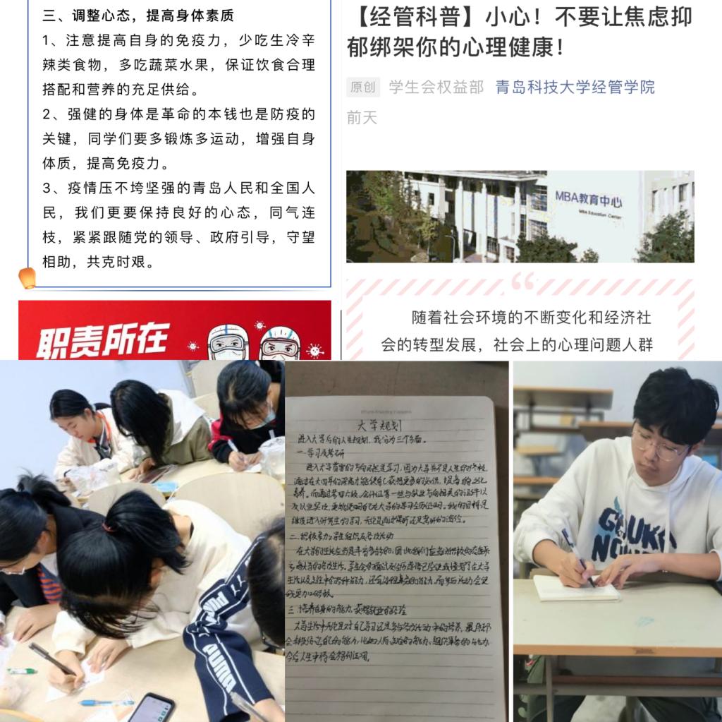 开展以“开启‘心’路程,享受‘心’生活”为主题的形式多样的主题团日活动,召开“关爱自我、温暖心灵”主题班会,以心理知识教育、防疫事例宣讲和日常防疫要素普及为重点,引导学生积极乐观正视身心问题,奋发蓬勃迎接大学生活;组织“我还是从前那个少年”和“最美笑脸”团日活动,通过学生分享自身进步点滴,引导学生重温入学初心,检视自身发展成果,以乐观稳定的心态、斗志昂扬的精神、创新自信的态度完善自我人格,迎接未来挑战;开展“预见未来的你”主题活动,鼓励学生制定大学生职业生涯规划和书写“致未来的一封信”,引导学生树立积极的生活态度,激发、调整、强化、升华学生的身心潜能,刻画开放活力、果敢创新、奋发有为的大学新篇章。同时学院利用官方微信公众号推送疫情期间心理健康知识科普文章,充分发挥网络思想政治教育的引领作用。