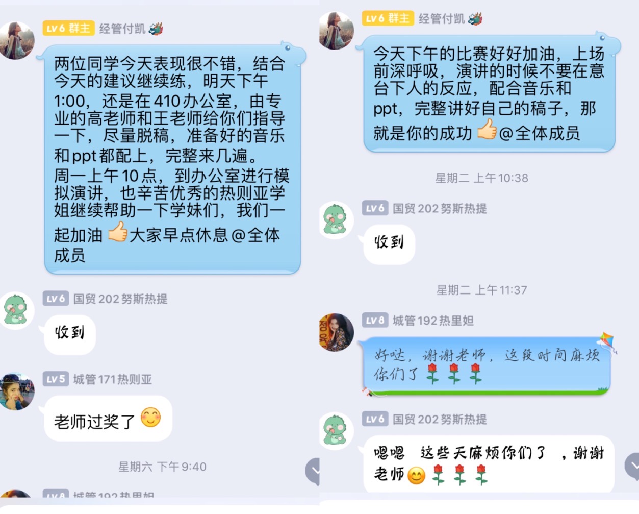 为弘扬中华民族共同体意识,同时为提升少数民族同学家国荣誉感、民族幸福感与集体归属感,学院积极组织发动学生参赛,少数民族学子热情配合,兴致昂扬,最终共有4名同学报名参赛,贯穿学院全部年级。经学院初步选拔,最终拟定2019级城市管理专业热里妲与2020级国际经济与贸易专业努斯热提同学参加校赛。为确保参赛质量,赛出华人色情