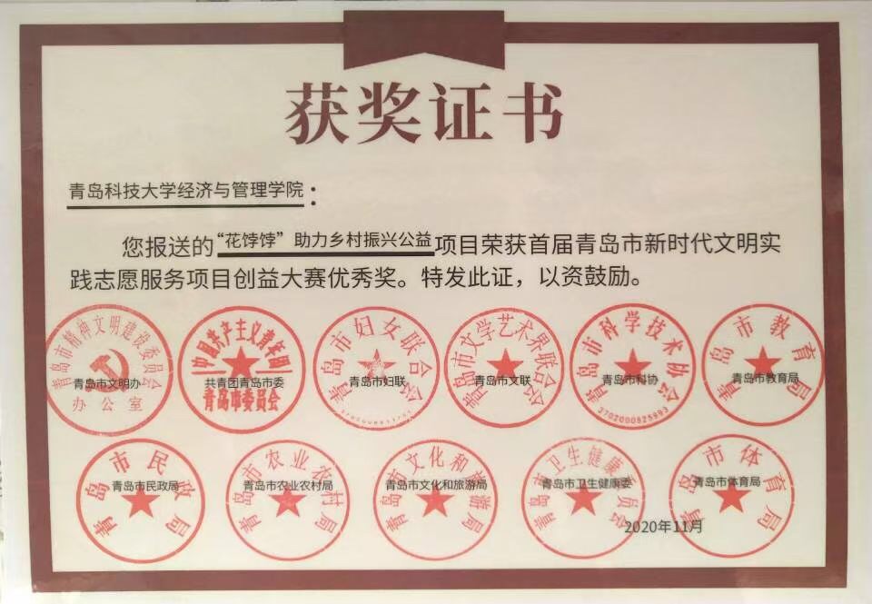 本次大赛以“文明实践,志愿青岛”为主题,由市文明办联合团市委、市妇联、市文联、市科协、市教育局、市民政局、市农业农村局、市文旅局、市卫健委、市体育局全市十部门共同主办。而此次,由我院学子长期运作的“花饽饽”助力乡村振兴公益项目在网络投票阶段从全市350余家单位、组织报送的共422个志愿服务创益项目中脱颖而出,成功晋级决赛,并最终以优异成绩斩获“优秀奖”殊荣!