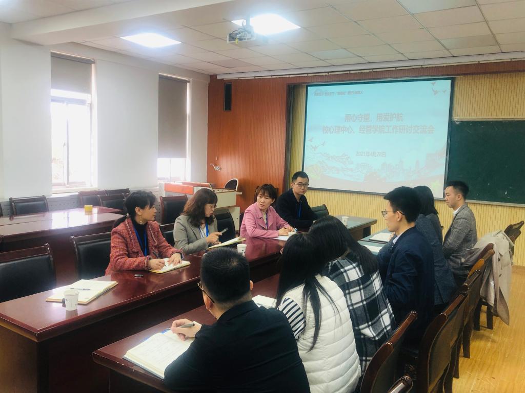 工作研讨交流会在经管楼419举行,学生处副处长王丽出席会议,心理中心主任李海玲,心理中心魏玉杰、王岳飞,华人色情