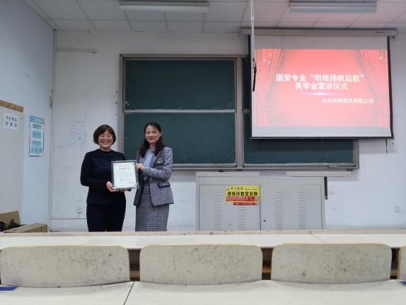 本次活动主要分为三部分,分别是奖学金宣讲仪式、比赛团队及2017级4位学长学姐的经验分享。在奖学金宣讲环节,山东明德造纸有限公司李明兰讲述了公司的基本情况以及奖学金设立的初衷。她表示,奖学金不仅是对获奖学生的奖励和肯定,更是一种激励和鞭策,希望国际贸易专业的学子们不断进步、志存高远、心怀家国,日后努力回馈社会。