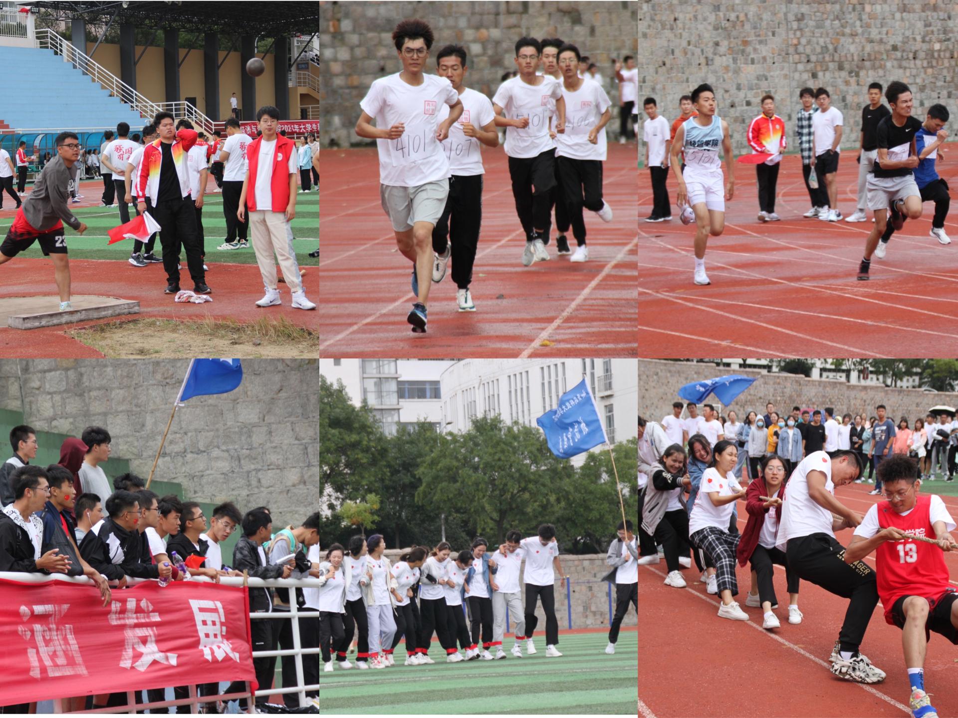 热血径赛场上,运动员们如闪电、似疾风,用速度展现青春的热情;激情田赛区上,运动健儿们用竞技诠释更高、更快、更强的体育精神;团体趣味赛包含拔河、10人11组、校园马拉松项目,各专业无不各显其能,尽遣主力。拔河项目中双方你拉过一尺,我争回一丈,尽显团队力量;校园马拉松项目,以学校体育改革红色运动打卡点为依托,以接力方式进行,让学生深切感受到体育“马拉松”也能玩出“新花样”。经管学子们手牵手,心连心,荣辱与共同进退,向众人展现他们积极向上的团结心与凝聚力。
