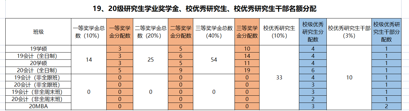 硕士研究生国家奖学金名额为3个(含体育学院)、学业奖学金一等、二等、三等各14个、25个、54个,校优秀研究生33个、校优秀研究生干部10个,现将研究生学业奖学金、校优秀研究生、校优秀研究生干部名额分配如下: