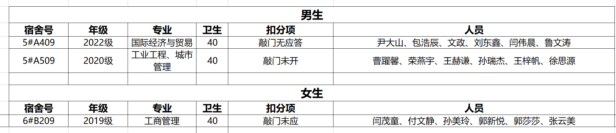 不合格宿舍如下: