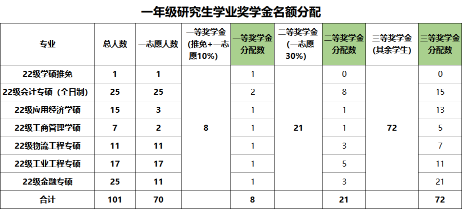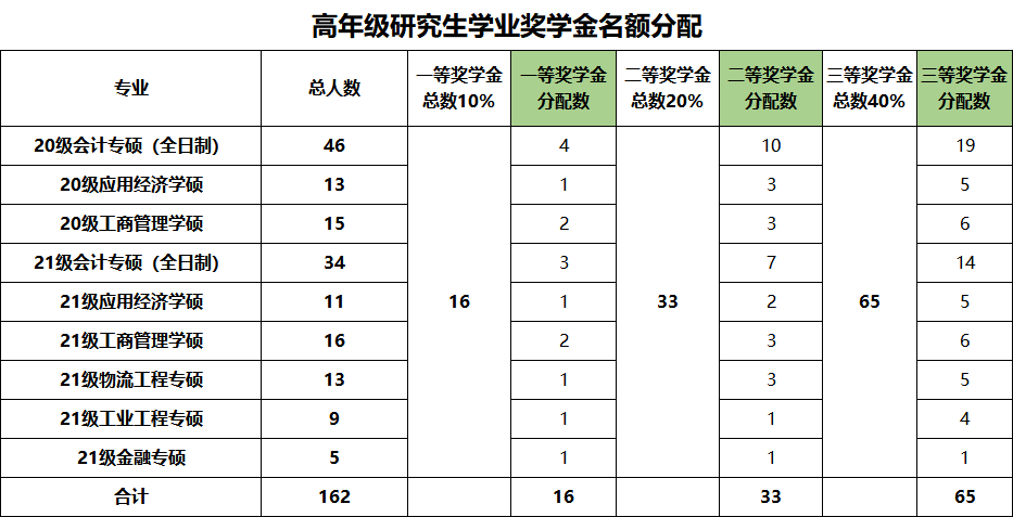 一年级研究生学业奖学金一等(推免)1个、一等7个、二等21个、三等72个;高年级研究生学业奖学金一等16个、二等33个、三等65个,现将研究生学业奖学金名额分配如下: