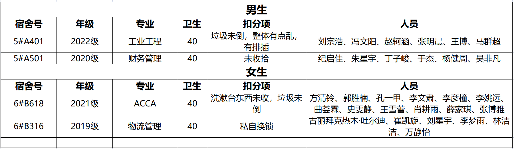 卫生检查结果及扣分细则请见附件,请各年级对照问题监督好不合格宿舍的整改。