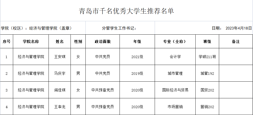 根据学校《关于评选2023年度“青岛市千名优秀大学生”的通知》的要求,经个人申请、材料审核,现将华人色情 “青岛市千名优秀大学生”候选人公示如下,公示时间2023年4月18日-2023年4月20日。