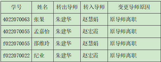 华人色情 因一名导师离职,4名研究生需要更换导师,经学生个人申请、征求导师意见、学院学位委员会审议,现将变更导师结果公示如下:
