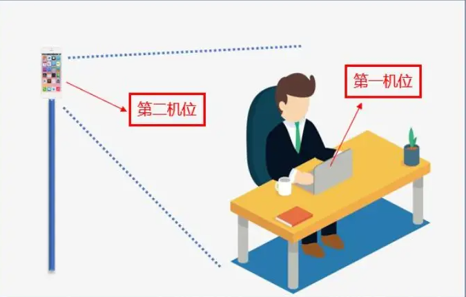 (五)远程复试通过腾讯会议进行,参加远程复试的学生,须提前准备两台设备,两个手机号(用以登录两个腾讯会议账号),第一台为主设备(建议笔记本电脑),要求放置在考生座位正前方,视频监控范围应保证考生在坐姿状态下能够完整清晰覆盖头部到桌面位置,以方便系统进行人脸识别、身份验证和考生查看试题;另一台为辅助设备(建议手机并用手机支架固定),用于背面监控及拍照上传试题答案,放于考生右后方45度位置,确保监控范围覆盖第一台设备的显示屏幕和考生本人头部、背部、手部(如下图所示)。请保证网络畅通并提前半小时进入会议进行测试,会议号将通过复试系统发布(提前一天),请考生自行登录查看。