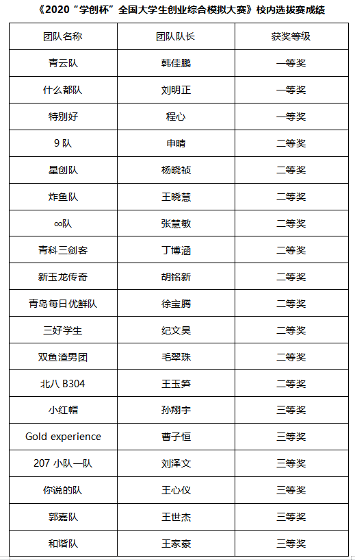 根据山东省教育厅《关于组织参加第八届“学创杯”全国大学生创业综合模拟大赛山东省省赛的通知》(鲁教高处函〔2021〕9 号)通知要求,学校于2021年5月25日至29日举行了创业综合模拟大赛、营销专项赛校内选拔赛,现将比赛结果进行公布。根据省组委会要求,创业综合模拟大赛、营销专项赛校内选拔赛一等奖的团队将代表学校参加山东省赛。