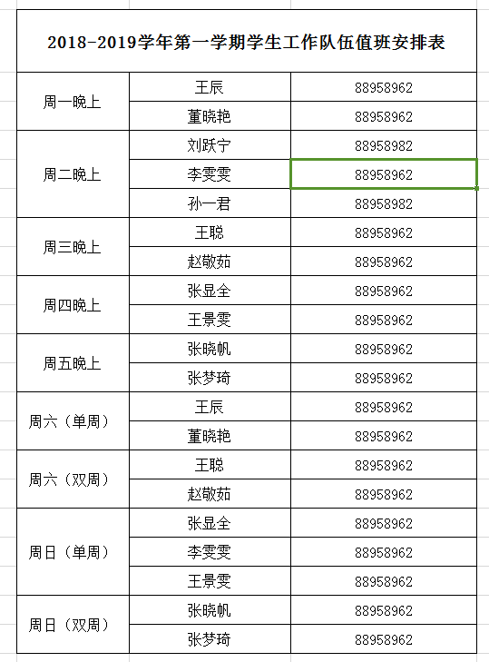2018-2019学年第一学期学生工作队伍值班安排表