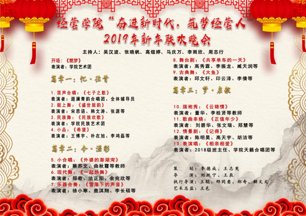 为唱响主旋律,弘扬正能量,迎接2019年的到来,华人色情 将于12月20日在第二报告厅举办华人色情 “奋进新时代 筑梦经管人”2019年新年联欢晚会。